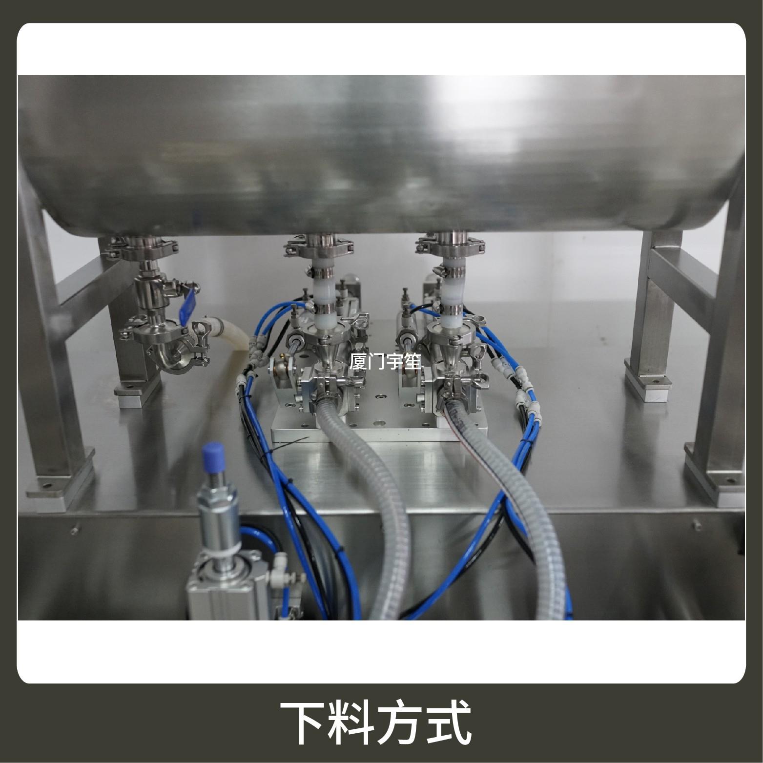 2、成品雙出,速度快,包裝流程全自動(dòng)、無(wú)需人工操作??筛鶕?jù)充填物料的性質(zhì)選配不同的下料結(jié)構(gòu)