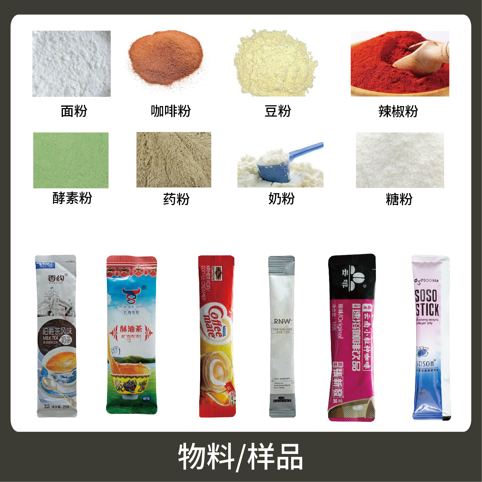1、適用于食品、醫(yī)藥、化工、化妝品行業(yè)中粉劑等物品的計量包裝,如:奶粉、蛋白質粉、咖啡粉、藥粉等。